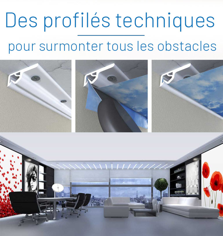 Les profilés sont développés pour les plafonds, les murs et les formes sur-mesure (caisson, panneau, cloison, cadre).